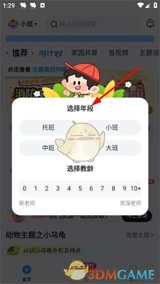 1、进入平台,可选择年段托班、小班、中班、大班和教龄根据自身情况进行选择,以便获取合适的幼教资源。