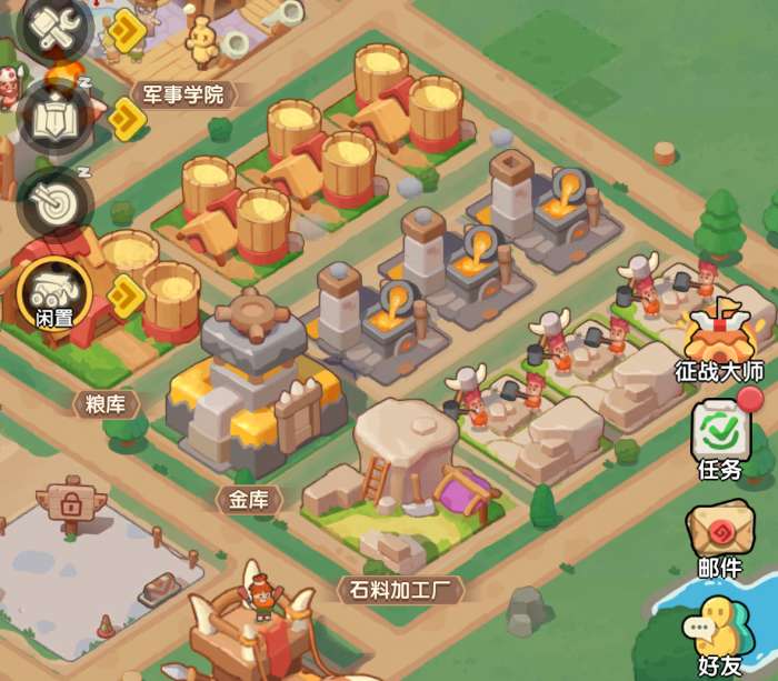 谷仓、炼金营、碎石台则构成了一个紧密协作的小团队。谷仓全力产粮草,有了它,咱们招兵买马才能底气十足;炼金营产出金块,这些金块可是军事学院搞科技研究的“香饽饽”;碎石台则提供石料,用于建造和升级各类建筑。