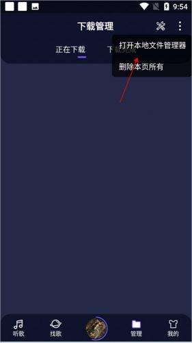 要在fly音乐中添加本地音乐,只需打开App进入【管理】页面,点击右上角的扩展菜单图标,选择【打开本地文件管理器】。接着,在手机存储中找到并选择你想要添加的本地音乐文件或视频(MP4格式在播放时会自动提取音频),最后长按选中的文件,点击页面顶部弹出的【打开】选项即可完成添加。