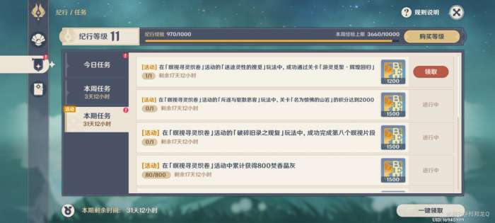 原石、限定满精四星单手剑、皇冠、角色天赋材料与圣遗物升级材料、摩拉、摆设等等。此次活动武器较为强力推荐大家优先获取噢。