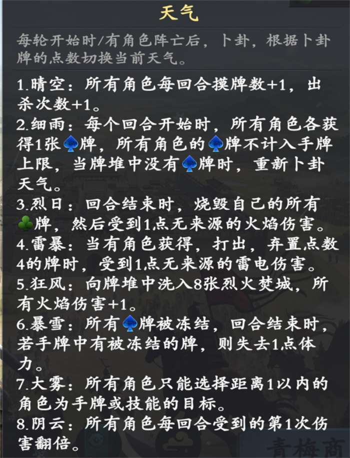 烈日:在这个天气下,有♣牌就要用掉,否则会被烧毁所有牌!