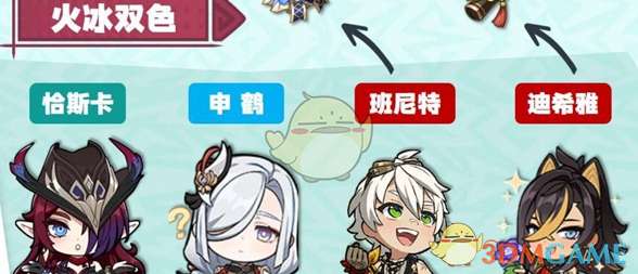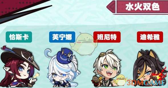 1、队伍组成:水辅助(芙宁娜/莫娜/心海/芭芭拉)+火辅助(班尼特)+第四人(香菱/希诺宁、钟离等泛用辅助)