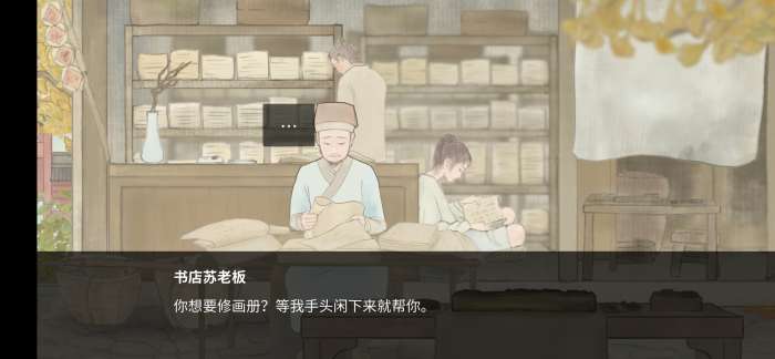 拿到线,去找书店老板修画册,拿着修好的画册找包子铺老板娘,先别去城北桥头(她老公还在码头右侧,先去找她老公)