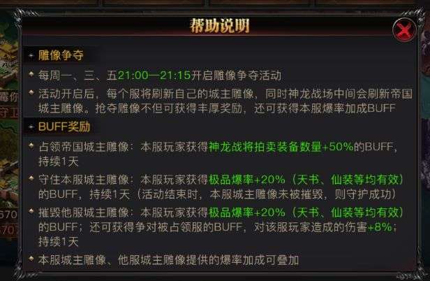 若同时达成占领中央帝国雕像攻占其他三服雕像守住本服雕像,将会达成全服极品装备爆率直达80%, 史诗级增益持续 24小时!