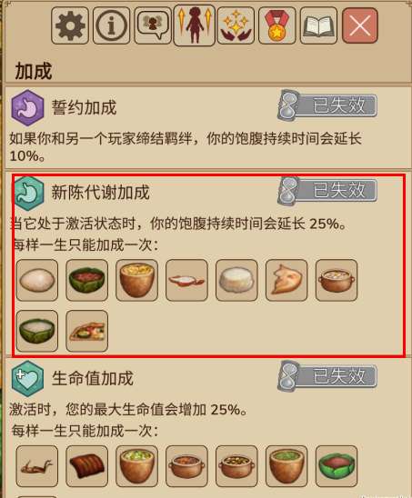 莫慌!在个人加成中,食用目标食物激活【新陈代谢】BUFF饱腹持续时间将会延长25%!这对经常忘记吃饭的村民很有用~