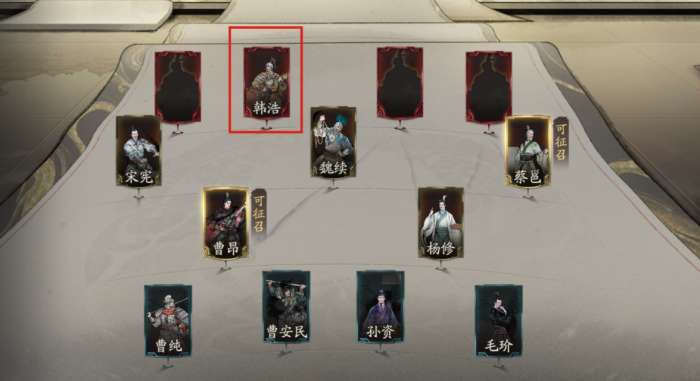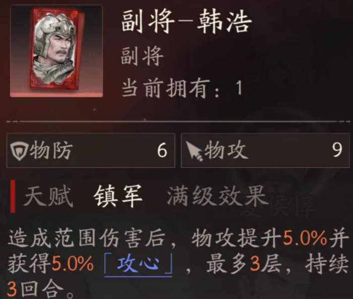 韩浩在游戏当中,是曹魏阵营的高品阶副将角色, 基础物理防御为六点,基础物理攻击为九点,他的主要技能是“镇军”,在造成aoe伤害之后,可以使得主将单位,提升5%的物理攻击倍率,同时附带有3.2%的攻心效果,该效果最多可以叠加三层,持续时间为三个回合。 韩浩还拥有韬略的技能效果,在战斗时,如若主将单位发动反击,那么伤害会增加1.5%,同时附带有伤害减免的效果,该效果为2%。 倘若玩家想要获取韩浩这一个角色,则需要进入到游戏的仙人探宝玩法内,直接取得时之精,最后使用时之精在仙人探宝当中抽取。