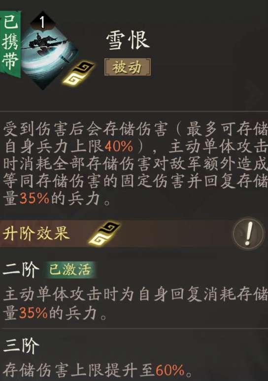 韩浩搭配夏侯惇招牌技能“刚烈武骑”时,不仅能够直接触发韩浩“镇军”效果,还能够叠加攻击以及吸血效果,不止如此,当夏侯惇进阶到三阶段后,他可以获取其核心技能“雪恨”,在每一次遭受攻击时都可以发动反击,同步触发韩浩的韬略效果。