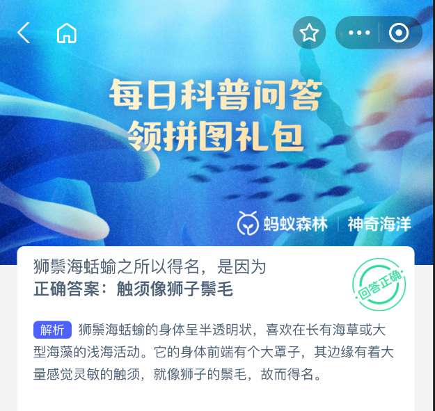支付宝蚂蚁森林神奇海洋2025年7月2日问题已经更新,今日题目是:狮鬃海蛞蝓之所以得名,是因为?正确答案是:【触须像狮子鬃毛】。狮鬃海蛞蝓它的身体前端有个大罩子,其边缘有着大量感觉灵敏的触须,就像狮子的鬃毛,故而得名。