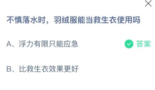 不慎落水时,羽绒服能当救生衣使用吗?支付宝小鸡课堂开课啦!每天花一分钟正确答题就能获得180饲料,喂喂小鸡就能贡献爱心啦!轻松又意义十足!2026年3月16日蚂蚁庄园的小鸡课堂题目正确答案是【浮力有限只能应急】,不慎落水时,羽绒服不能救生衣使用,浮力有限只能应急。