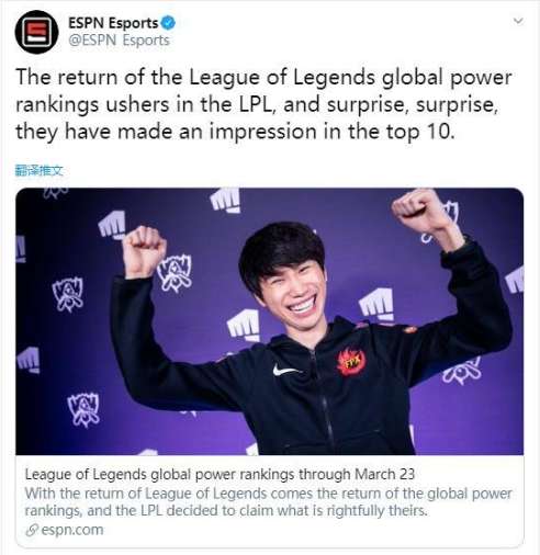 日前,ESPN发布最新全球LOL战力战力排行榜,LPL春季赛回归后,LPL赛区战队加入到这次排名之中,而暂时停赛的LCK赛区战队未加入此次榜单评选。