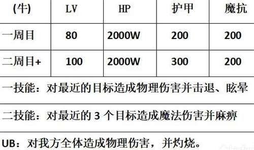 PS:牛的难度不同于上次的羊,是真正让人绝望的存在。极高的物理攻击可以让牛在击退前排坦克后两刀轻松解决位于2号位的“狼狗”。除此之外牛二周目后300的超高护甲亦会令我方输出乏力而其全体伤害的UB和6秒的灼烧,若练度不够请带上群奶。