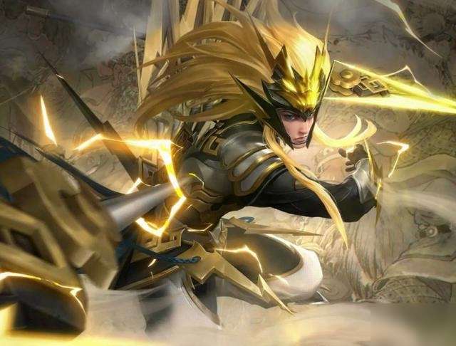 【服饰元素设计】极具视觉冲击力的金色长发、金狮盔,搭银黄铠甲矫健似猛兽,以直角排列和闪电纹样表现极速突进的张力。