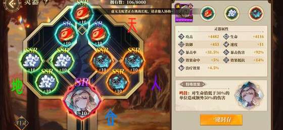 灵器一共分为四个部分:天、地、人、和,让我们从各个部位中挑选出适合天狗的灵器以供选择。