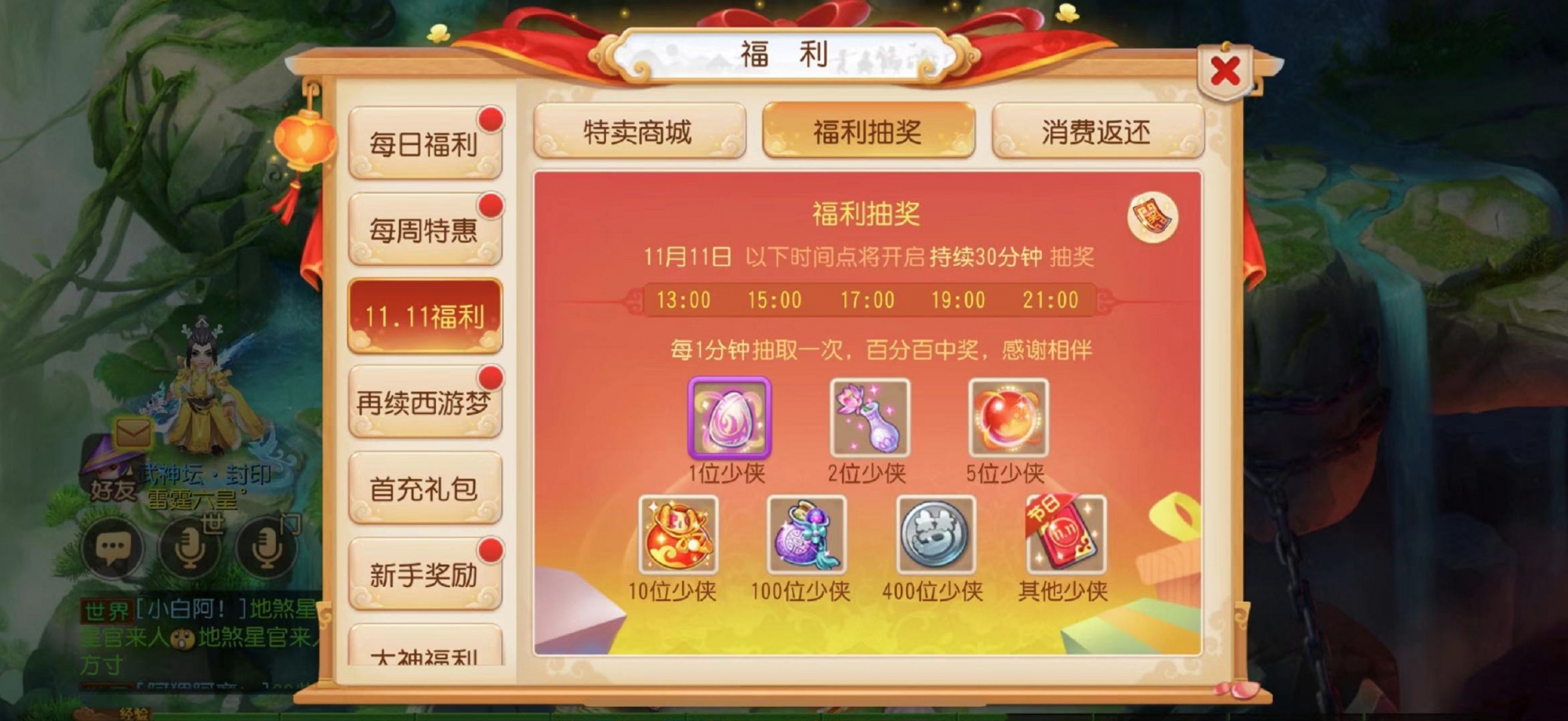 在11月11日当天的13:00、15:00、17:00、19:00和21:00,《梦幻西游》手游还将面向全体玩家开启福利抽奖活动。每轮抽奖将持续30分钟,期间每一分钟抽取一次。