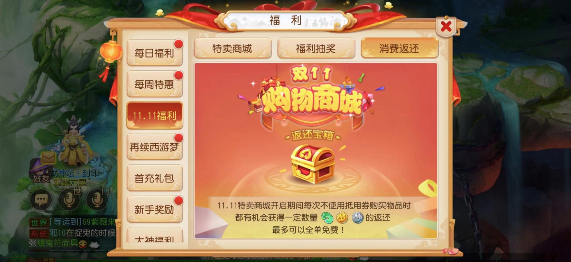 在特卖商城开放期间,《梦幻西游》手游还将为玩家带来消费返还活动。若是玩家在购买双11特卖商品时没有使用抵用券,即可获得一定比例的仙玉、金币、银币返还。最高可以获得全额免单福利!