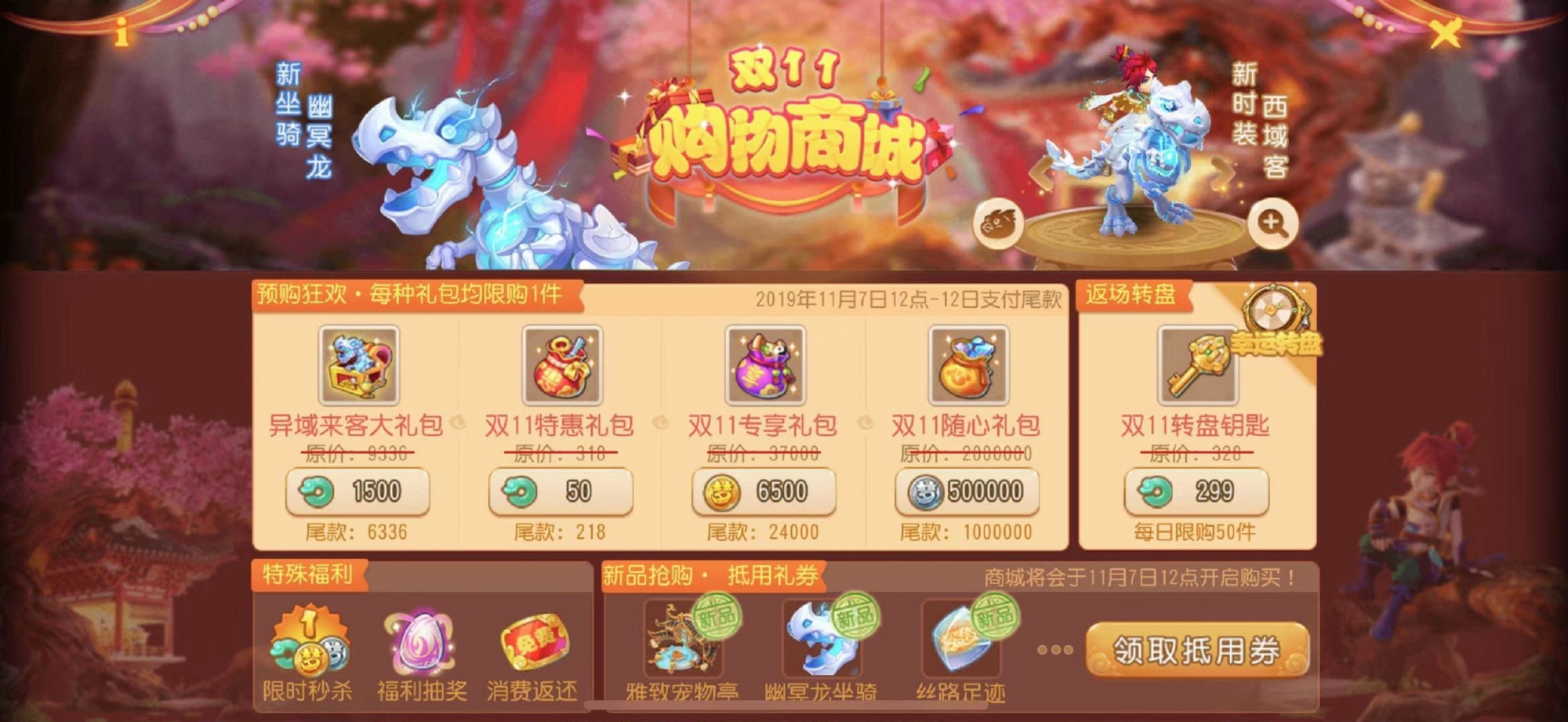 在逛商场的同时,玩家也可以花费少量货币领取专属抵用券,将新坐骑幽冥龙、雅致宠物亭、丝路足迹等酷炫好礼以最低价格带回家!