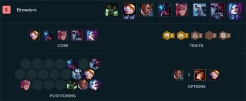 这套阵容是以金克丝为核心打输出,配合2枪手离子火花让金克丝快速启动打出伤害,同时6斗士增加高额生命值让前排站的更久,双海克斯禁装备。阵容主要优势在于6斗士容易成型,好过度强度大,阵容里没有高费英雄,变身后的金克丝伤害爆炸。