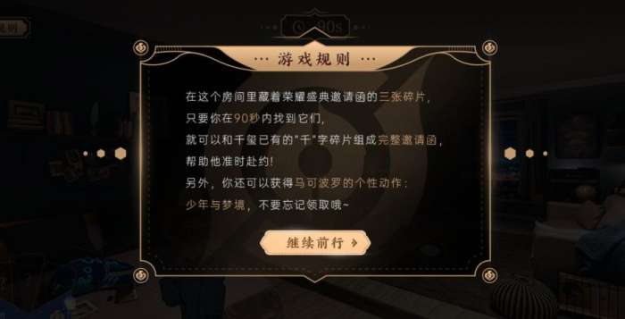 游戏规则:在这个房间里痞藏着荣耀盛典邀请函的三张碎片,只要你在90秒内找到它们,就可以和易烊千玺已有的“千”字碎片组成完整邀请函,帮助他准时赴约!另外,你还可以获得马可波罗的个性动作,少年与梦境,不要忘记领取哦。