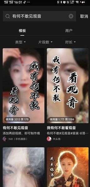 3.打开剪映软件,在上面的搜索框位置输入【有何不敢见观音】点击搜索,搜索后可以弹出许多的视频内容;