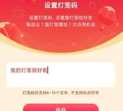 3.设置灯笼码,送重复灯笼给好友,每送出1盏灯笼增加1次点亮机会,灯笼码仅支持汉字,不支持标点符号;