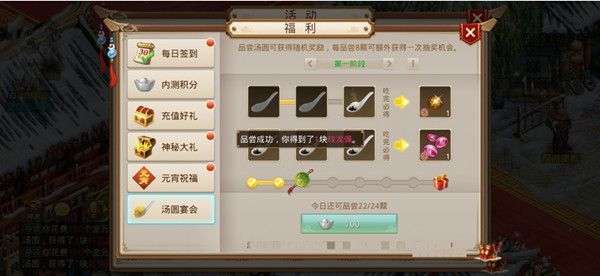 (1)玩家可以从游戏内福利活动-汤圆宴会入口进入参加。活动期间,将有4个阶段的汤圆,每个阶段6颗,一行3颗 。