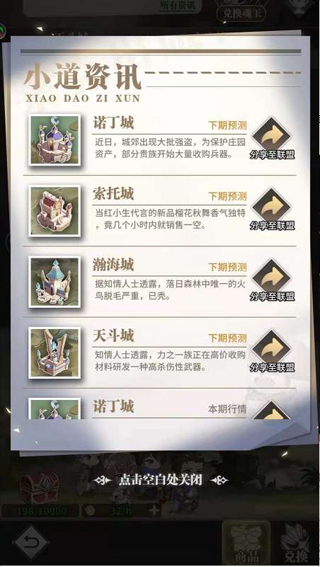 行商前请注意查看小道资讯,小道资讯汇集着四大商会的下期商品行情预测,由于商品数量非常多,因此记得分享至联盟频道已查看详细价格波动。玩家的目标就是在上一期准确预判并购入商品,然后前往指定商会,这样就能获得高额利润啦!
