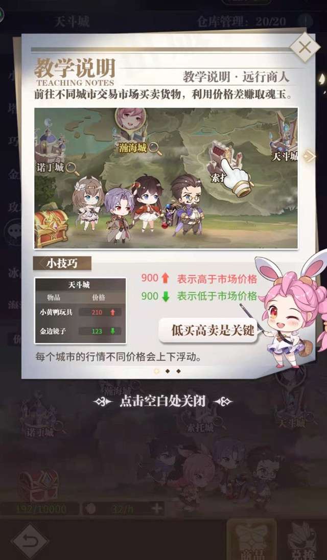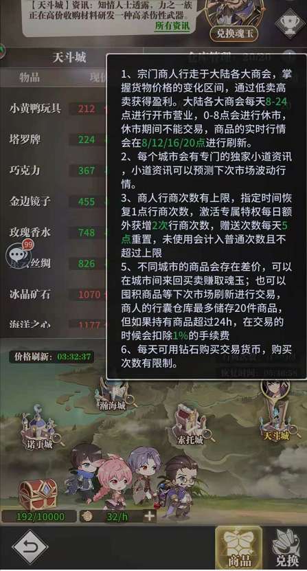 远行商人游走于大陆的各大商会,通过低买高卖获得盈利,大陆各大商会的商品价格均不相同,且价格在8/12/16/20点分别刷新一次。每天8-24点商会营业,0-8点休市,休市期间无法交易。