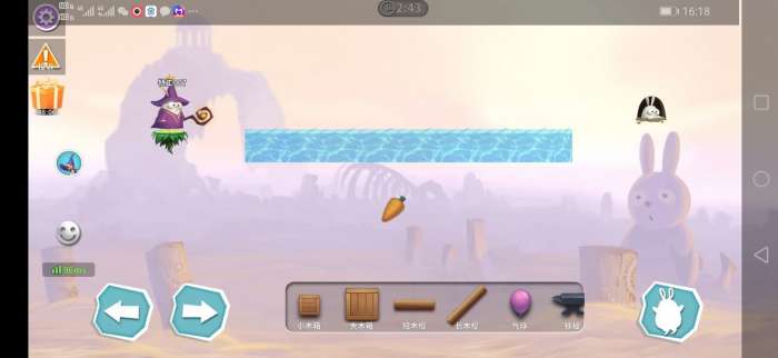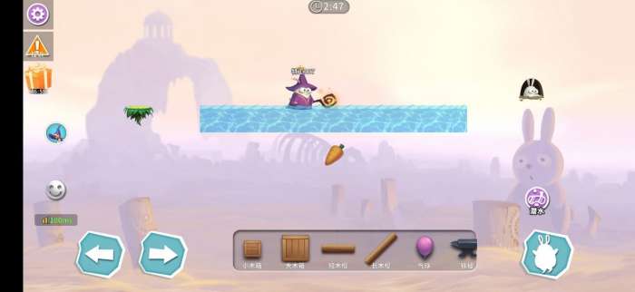 在萝卜上方稳定后,按住右下角的潜水(按一下即可,不能一直按,会掉下去前功尽弃),拿到萝卜后迅速跳跃(整个过程不要离开水,楼主放木条是为了截屏方便),但拿了萝卜后会不停的下沉,所以要不停的“点击”跳跃键,确保不会掉下去。