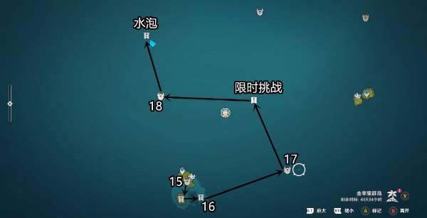 下图这个路线可以拿七个,从最上面一个小岛开始走,后面还有水泡,可以拿宝箱。