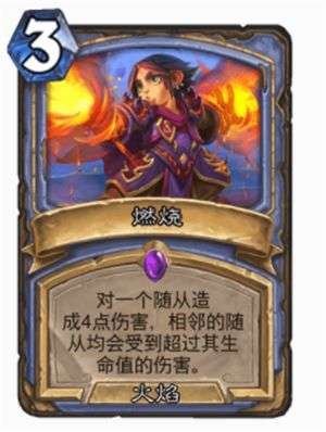 燃烧是一张严重被低估的解场法术,单就3费对一个随从造成4点伤害的效果就已经不亏了,另外其溢出的伤害还可以伤害相邻的随从,在面对一些快攻卡组时十分强势,最高3费可以打出7点伤害之多,可以其上限之高。