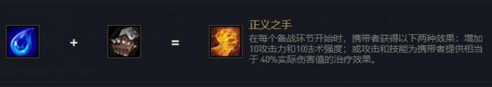 正义之手:在每个备战环节开始时,携带者获得以下两种效果:增加10攻击力和10法术强度;或攻击和技能为携带者提供相当于 40%实际伤害值的治疗效果。
