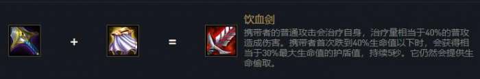 饮血剑:携带者的普通攻击会治疗自身,治疗量相当于40%的普攻造成伤害。携带者首次跌到40%生命值以下时,会获得相当于30%最大生命值的护盾值,持续5秒。它仍然会提供生命偷取。