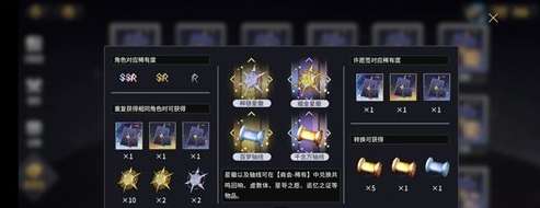 重复获得相同的角色即可获得许愿签,如果获得相同SSR角色、SR角色可获得粹银星徽与耀金星徽。每个图案倍镜颜色代表不同稀有度的许愿签,许愿签又可以转换获得百梦轴线与千念万轴线,这两样道具可在【商会-稀有】中的【轴线兑换】粹银星徽与耀金星徽;而粹银星徽与耀金星徽在【商会-稀有】中兑换共鸣回响、虚体数、星导之愿以及回忆之证等物品,与尼奥德的作用相等。