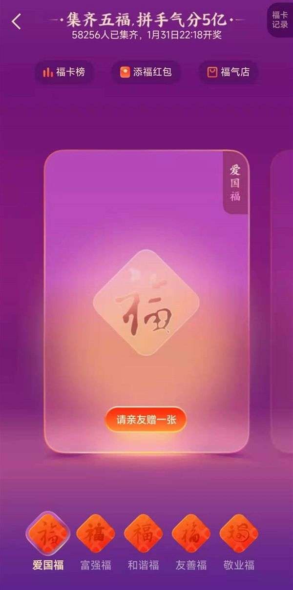据介绍,今年在集齐了“爱国”“富强”“和谐”“友善”“敬业”这五张福卡后,用户不仅可以分到红包,还能用多余的五福福卡兑换福字贴和五福定制款周边,首次上线的支付宝五福“福气店”准备了丰富的礼品供用户兑换。