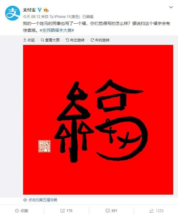 今年马云写的福字也是比较有特色的,福字的左边是树林,也对应着支付宝的蚂蚁森林。