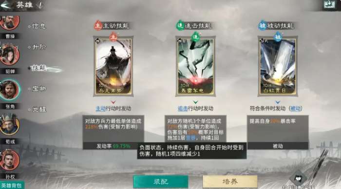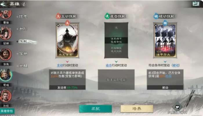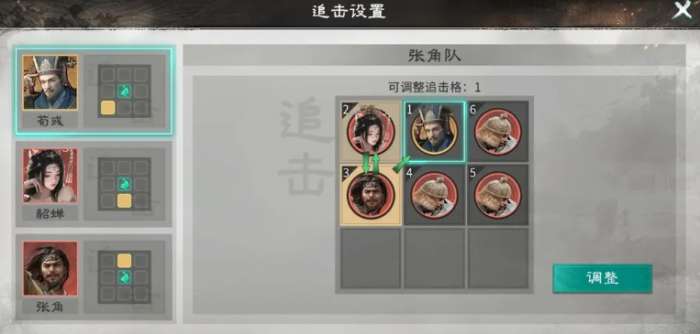 而貂蝉的话,她可以站张角的追击格子当中,荀彧在这里其实不用担心他的追击格子有没有踩到,优先保证貂蝉她能够占到追击,因为三个英雄的话,在这里如果要进行升级,基础都是达到6星品质才可以改变他们在追击格上面的选择,整体队伍在搭配起来之后,荀彧他身上的话可以带天赋效果王佐之才,利用王佐之才的效果可以给张角带来一定的防御以及攻击上面11%的提升之后,还可以带来15点的四维属性增加,在这里利用这样的效果可以让他在被敌人攻击阵亡的时候,还可以保证自己的技能达成足够的生效时间。