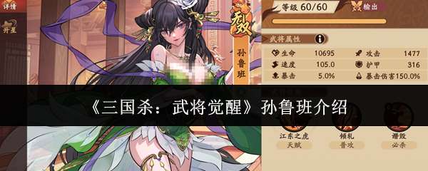 三国杀武将觉醒孙鲁班怎么样?在三国杀武将觉醒游戏里面,孙鲁班是非常强势的输出角色,而且稀有度也是最高的无双级别,目前玩家可以从新手招募卡池中抽出。那么很多新手想知道三国杀武将觉醒孙鲁班怎么样?值不值得培养?那么今天小编就给大家带来关于孙鲁班技能组的详情解析,还有培养建议,感兴趣的朋友快往下来看看吧。