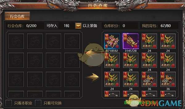 3、行会仓库:捐献装备可以获得仓库积分,消耗仓库积分可兑换装备