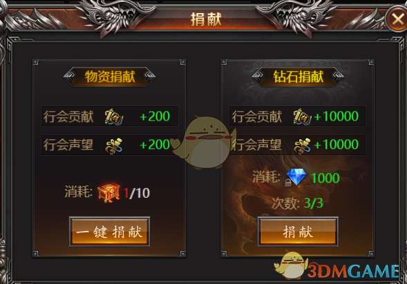1、行会捐献:可获得行会贡献和行会声望。行会贡献可以用来升级行会技能;行会声望可以在行会商店购买物品