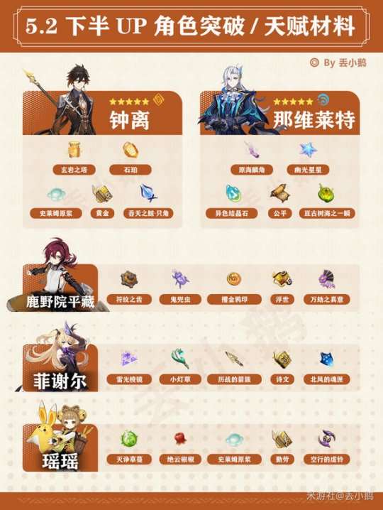 哈喽旅行者们大家好呀,本期给大家带来的是【原神5.2】Up角色突破/天赋材料~