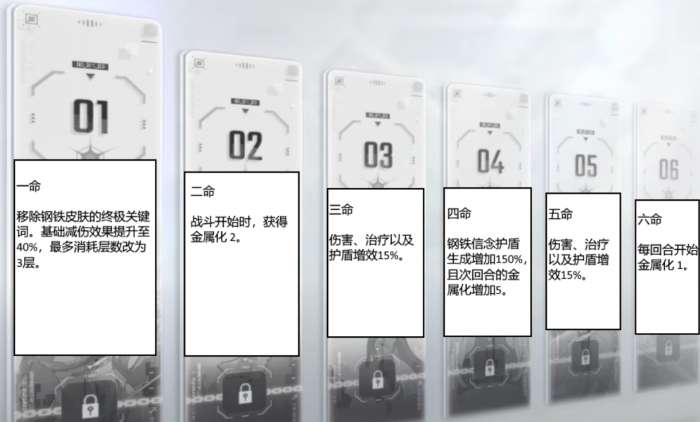 其实卡牌在后期激活以后带来的命座数值都是不一样,大家也可以把这里的命座看作是另外一类的技能加成效果,比如说游戏当中主要的一个角色是艾美,艾美她自身的命座效果当中可以带来的一些关键效果都是对于她的伤害、治疗以及护盾增效的百分比,这里一共有6命的效果,其中最强势的还是1命和6命,如果是在1命当中他有出钢铁皮肤的效果,这类效果对于它的基础减伤效果能力会得到40%的加成,最多的消耗层数也改为三层,如果是在5命当中的话带来的则是重复效果,基础伤害治疗以及护盾数值上面都会有15%的一个概率加成,这样的效果对于她的命座提升能力来说能够给角色带来很多的加成效果。