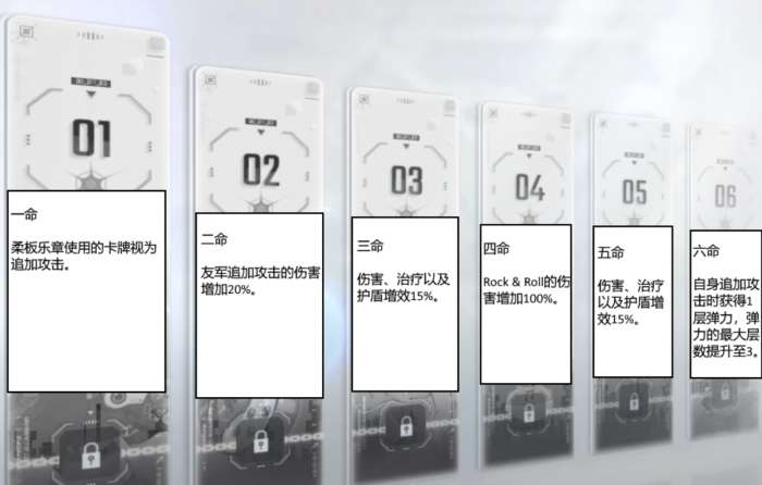 带来的效果是自身在最佳攻击的时候会获得一层弹力,这个弹力的状态在最大的时候可以叠加到三层,后期根据弹力的状态会对敌人造成的伤害数值也会更多,其中带来伤害的时候,还会为己方的士气带来更多的提升,所以在这里他的命座效果上面只有两命是比较类似的,也就是其中的3命和5名,都是在三项属性上面有一样的百分比提升效果,虽然是可以进行叠加,但是在这样命座加层的同时,大家可以判定的就是角色在命座激活的时候,会有一些重复的命座效果出现,但是能够达到的百分比是会从基础的百分比继续往上增加,所以大家可以根据不同角色他们的命座后期提升的能力,来判断这些角色能够在队伍里面占据一个什么样的定位。