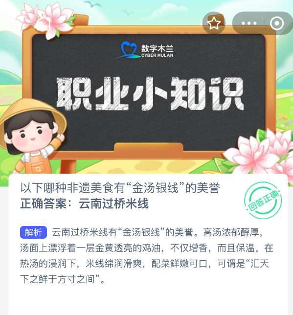 以下哪种非遗美食有“金汤银线”的美誉?【蚂蚁新村每日一题】2025年10月31日题目已发布!坚持答题,积累木兰币,即可加速小镇建设。答对本题,立即可享“产速+3/时”的加速奖励!今天正确答案是【云南过桥米线】。云南过桥米线有“金汤银线”的美誉。高汤浓郁醇厚,汤面上漂浮着一层金黄透亮的鸡油,不仅增香,而且保温。