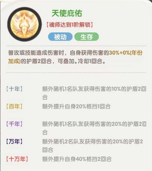 天使真身:开局为自身及两名队友提供护盾,并永久提升全队伤害减免,十万年魂环下减益效果尤为显著。