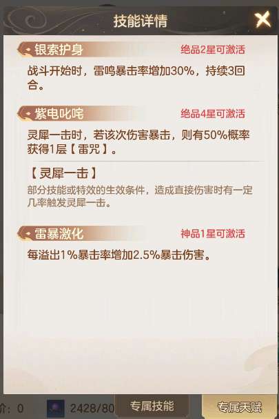 暴击越高,爆伤越大,这是雷鸣的核心天赋。作为紫卡,升星难度低,容易升至满星。