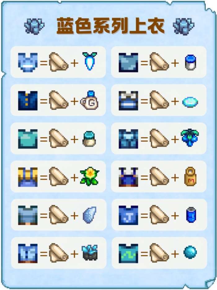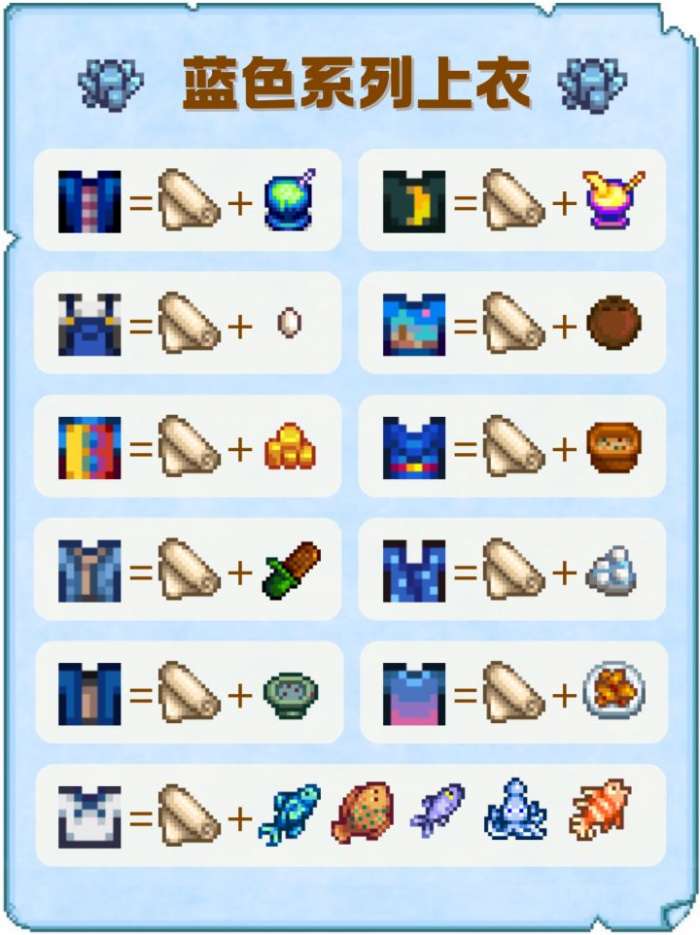 星露谷物语蓝色上衣有哪些,在《星露谷物语》中,蓝色系上衣可通过合成获得,以下是可制作的蓝色系上衣配方,本篇整理了许多蓝色系的上衣配方都是无mod版。