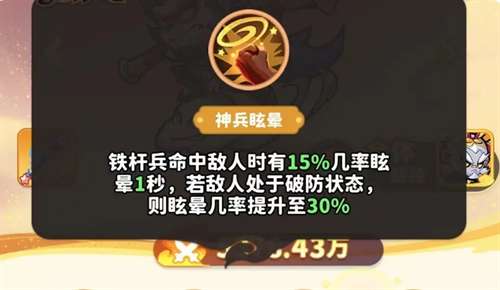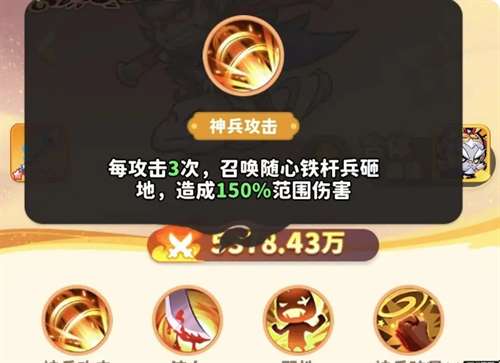铁杆兵命中敌人时有15%几率眩晕1秒,若敌人处于破防状态,则眩晕几率提升至30%。神兵眩晕是范围群控技能,需要配合神兵攻击和其他带有破防效果的物理辅助使用,可以延缓敌人的进攻步伐。【通臂猿猴】绝品物理辅助英雄,特点是友方增益、破防加攻。它共有4个技能: