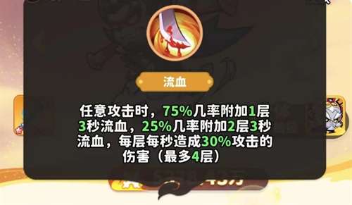 任意攻击时,75%几率附加1层3秒流血,25%几率附加2层3秒流血,每层每秒造成30%攻击的伤害(最多4层)。流血是六耳猕猴的核心伤害技能,配合神兵攻击能施加范围流血,流血的伤害比普通技能要高,4层流血的情况下每秒能造成120%攻击的伤害,持续3秒,伤害相当可观。
