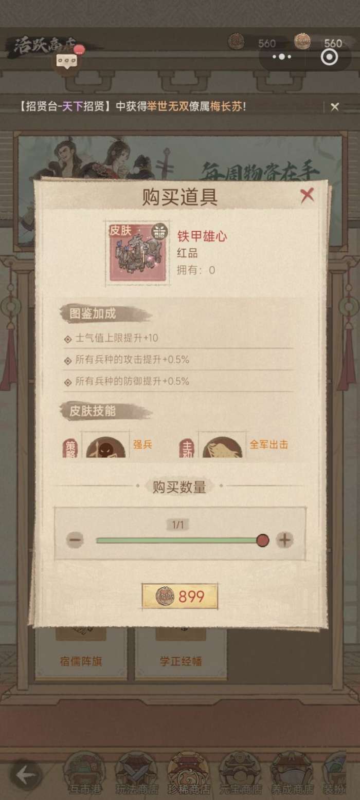 《这城有良田》平民车皮攻略:优先用荣耀币兑换“铁甲雄心”(全场景增伤15%)和“沙漠之舟”(每周免费高迁),功能性强且零氪可得。资源囤积党可选“缘蕴五行”。注意士气上限300,同时生效最多5个技能,别盲目囤皮。