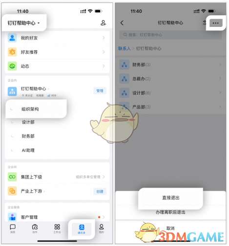 打开 手机端钉钉 > 进入 通讯录,左上角可切换对应企业,点击 组织架构 > 右上角 ... > 选择 直接退出